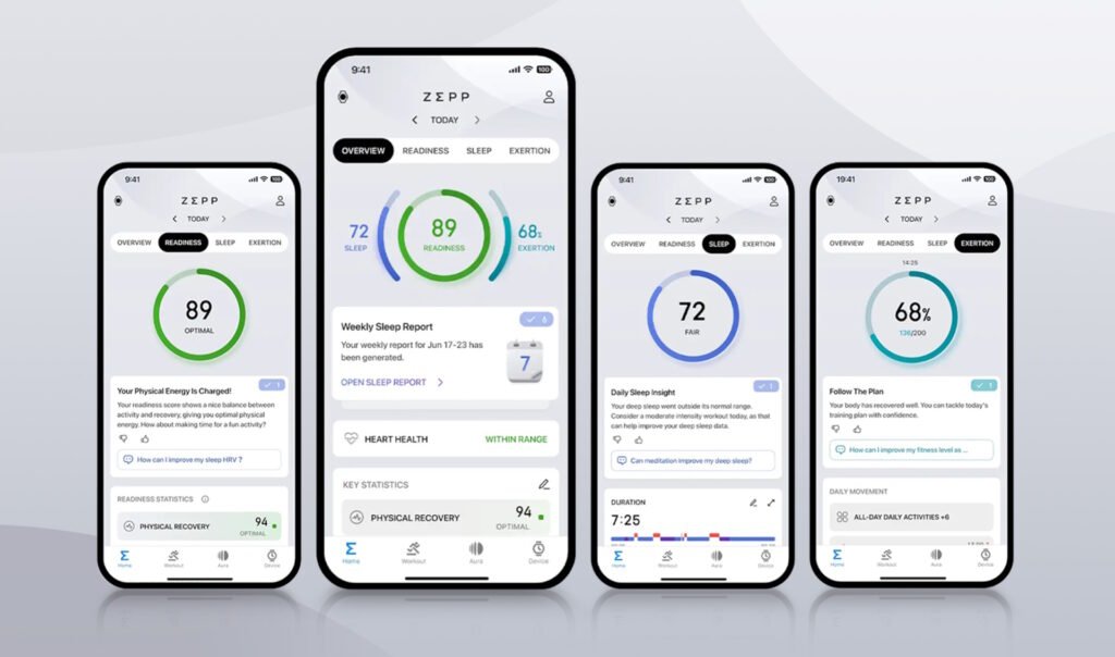 La nuova app Zepp ha introdotto una rinnovata interfaccia utente, con funzionalità avanzate studiate per migliorare l’esperienza d’uso nel monitoraggio di tutti i giorni. La nuova interfaccia presenta tre indicatori fondamentali: Affaticamento Fisico e Mentale (il già citato Readiness Score), Qualità del Sonno e Raccomandazioni Personalizzate per il livello di intensità del prossimo esercizio.