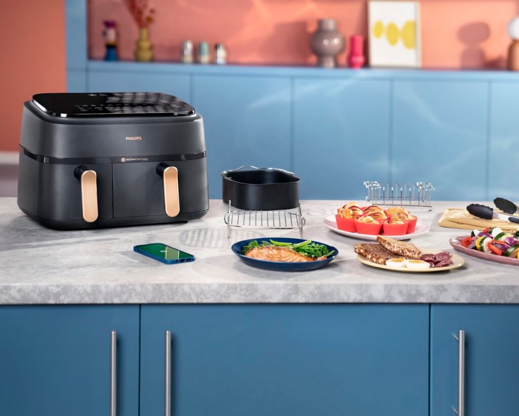 Philips ha presentato la nuova Airfryer Serie 3000, un modello rivoluzionario pensato per soddisfare le esigenze delle famiglie contemporanee. Questo nuovo elettrodomestico si distingue per il doppio cestello di diverse dimensioni, una caratteristica ideale per preparare pasti completi e bilanciati in un’unica sessione di cottura.