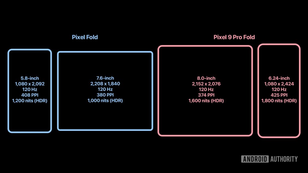 La grande novità per il Pixel 9 Pro Fold sarà tuttavia relativa alle dimensioni: addio al caratteristico formato squadrato in favore di uno un pochino più slanciato, in effetti molto simile a quanto propone OnePlus con il suo Open. Una via di mezzo, diciamo, tra la linea Galaxy Z Fold e il Pixel Fold originale. Il display interno sarà insomma quasi perfettamente quadrato, con giusto un’ottantina di pixel in più in larghezza (su circa 2.000). Di seguito riepiloghiamo tutti i dettagli emersi fin qui, e alleghiamo anche lo schema della fonte che aiuta a visualizzare i vari display anche a confronto con le precedenti generazioni.