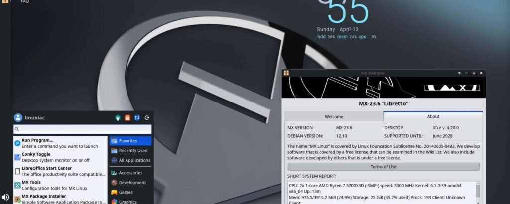 Tra le principali novità introdotte, MX-23.6 aggiorna innanzitutto i repository Debian e MX all’ultima versione, garantendo un sistema aggiornato. Le edizioni che fanno uso dell’ambiente desktop Xfce adottano ora la versione 4.20, offrendo un’interfaccia più moderna e reattiva. A essere aggiornata è anche l’edizione MX Raspberry Pi Respin, con i pacchetti più recenti dai repository MX e RPiOS, per garantire prestazioni ottimali anche su dispositivi come il Raspberry Pi.