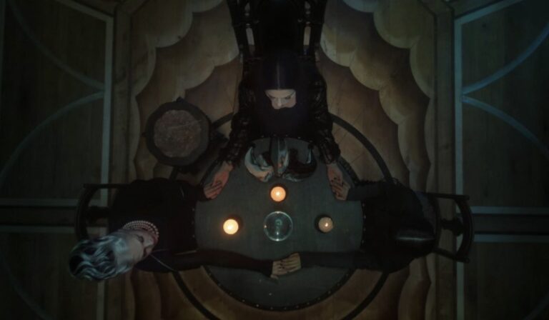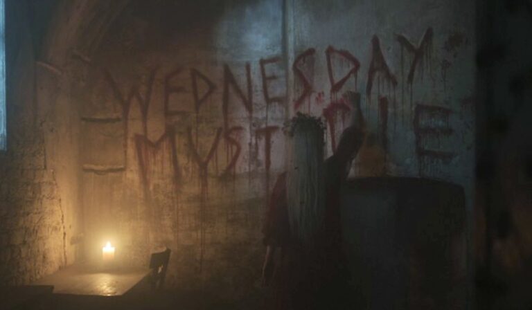 Il diario di Ofelia è un atto di fiducia… o di disperazione? Sfogliandolo in moto, Mercoledì arriva a una pagina con disegnata una faccia con le lacrime: parte una visione improvvisa. Mercoledì vede Ofelia in una cella, rinchiusa. La camera ci porta da nonna Hester, che raggiunge un luogo segreto. Apre una cella dove c’è una donna con i capelli biondi lunghi: sulle pareti, scritto col sangue, le parole “Mercoledì deve morire”. È Ofelia.