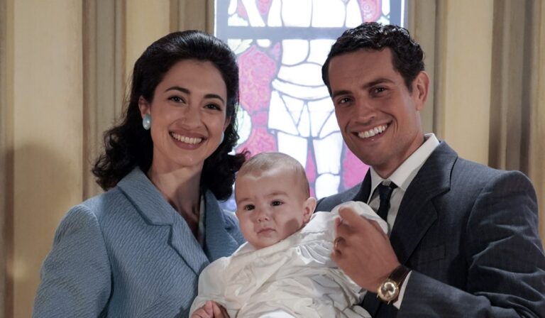 Da sinistra: Clara Danese (Elvira Gallo), il piccolo Andrea e Emanuel Caserio (Salvatore Amato) in un posato per “Il Paradiso Delle Signore 10”. Credits: Rai.