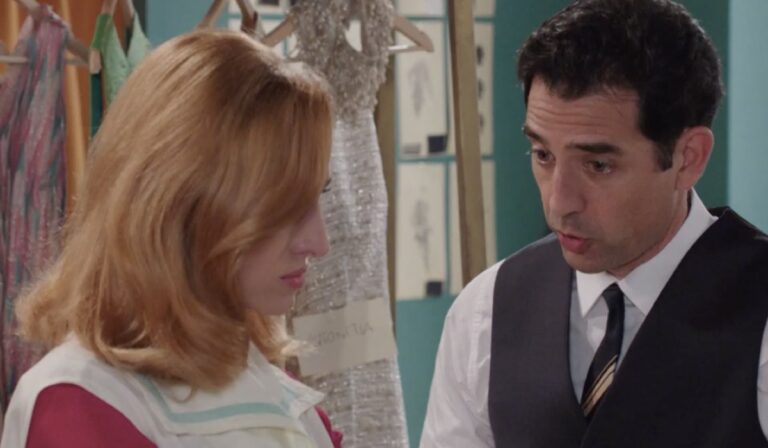 Da sinistra: Ilaria Maren (Delia Bianchetti) e Luca Ferrante (Gianlorenzo Botteri) in una scena della puntata 5 de “Il Paradiso Delle Signore 10”. Credits: Rai.